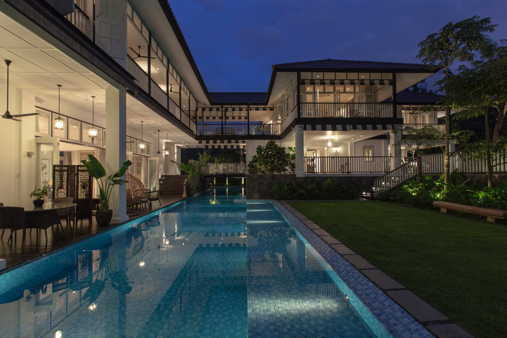 The house is split into two blocks—a master block and a children’s block—connected by a verandah bridge that spans over a long swimming pool. This design allows for privacy while promoting outdoor living, a hallmark of colonial architecture. Broad verandahs, over-sailing pitched roofs, and natural ventilation are key features, enhancing the tropical lifestyle the homeowner desired.