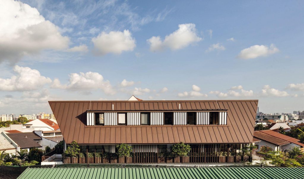 For the young family inhabiting this house in Thomson Heights, directing visitors to their abode is certainly not a difficult task. It can be easily identified by its main roof, which is a variation on the classic typology of Borneo high pitched roofs. Massive and iconic, the roof dips down from the attic all the way to the level below it.